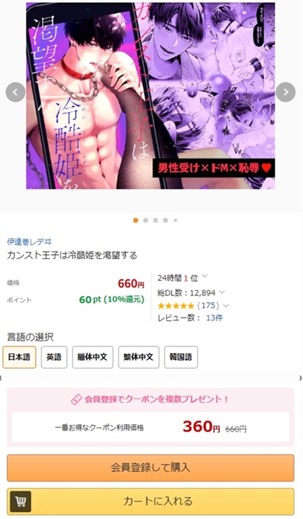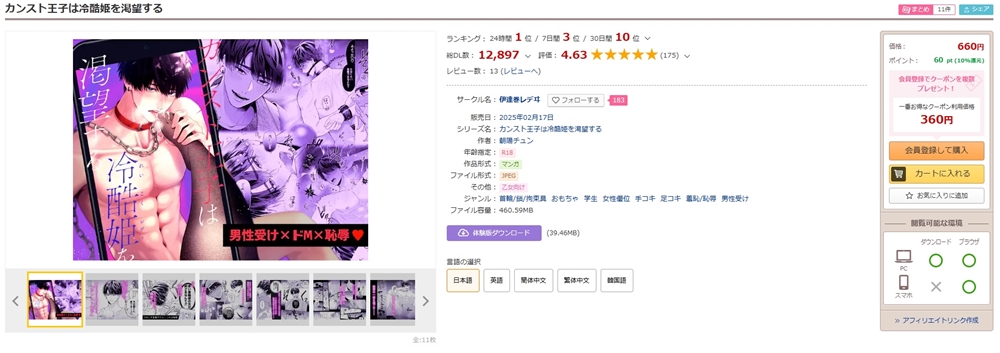 - 『カンスト王子は冷酷姫を渇望する』を読むならDLsiteがおすすめ。音声作品やゲームに使えるクーポンも配布されているので、他の同人作品が欲しくなったときにもお得にお買い物できます。