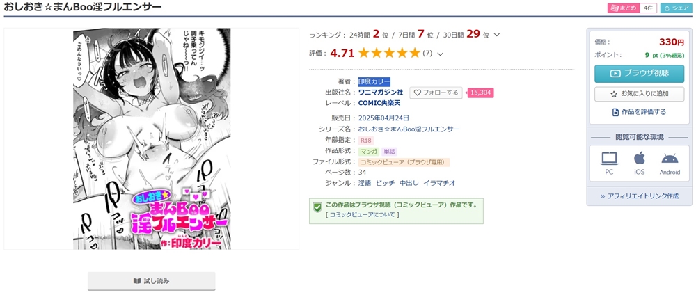 『おしおき☆まんBoo淫フルエンサー』みたいな単話作品だと、マンガがほとんど1本タダになります。