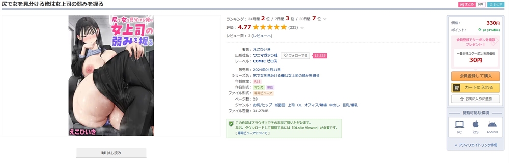 『尻で女を見分ける俺は女上司の弱みを握る』をほぼ無料、少しでも安くで読むならDLsiteがおすすめ!