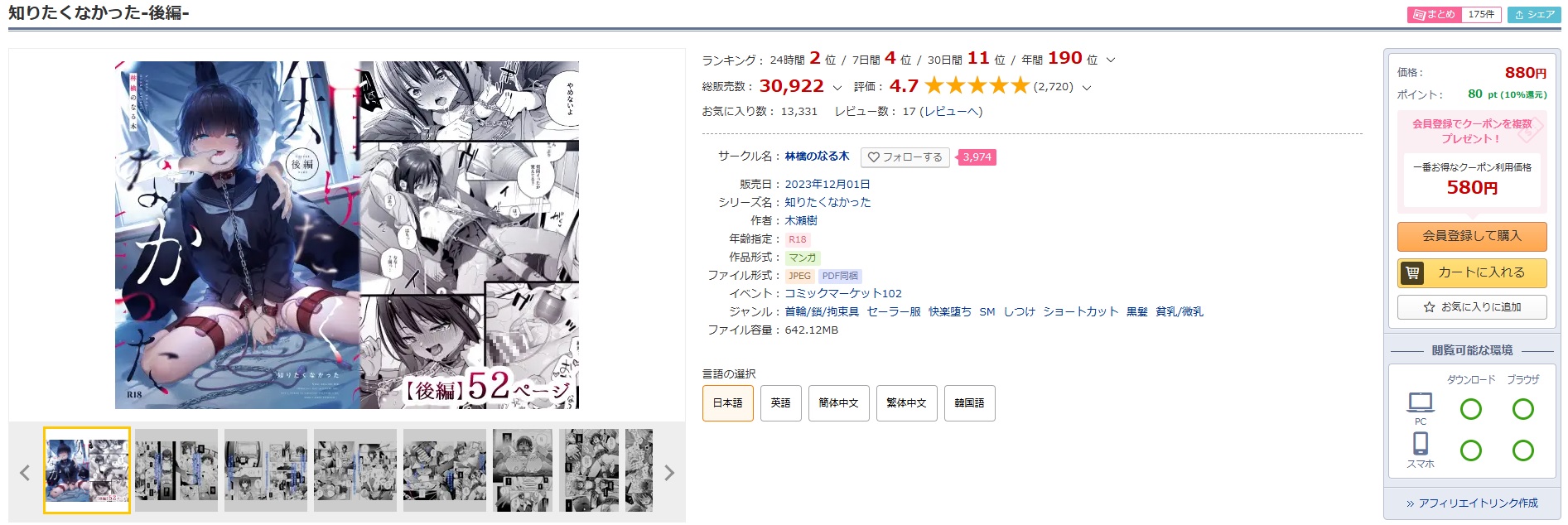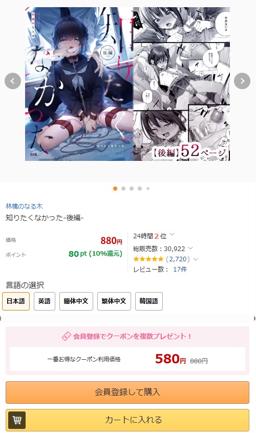 - 『知りたくなかった-後編-』を読むならDLsiteがおすすめ。音声作品やゲームに使えるクーポンも配布されているので、他の同人作品が欲しくなったときにもお得にお買い物できます。