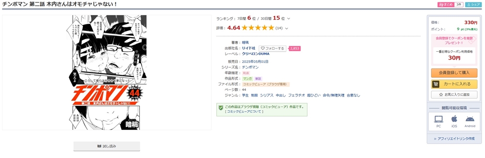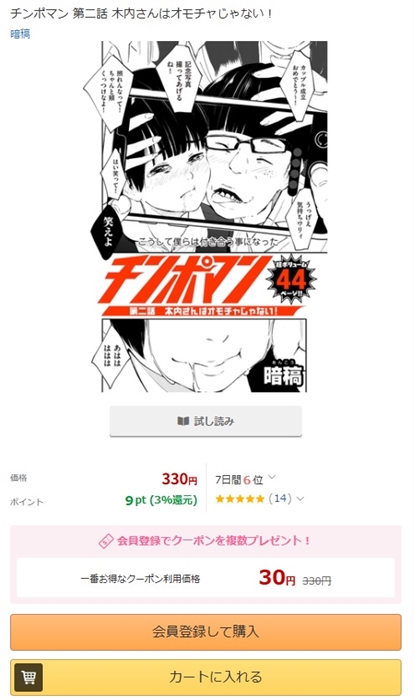『チンポマン 第二話 木内さんはオモチャじゃない!』みたいな単話作品だと、マンガがほとんど1本タダになります。
